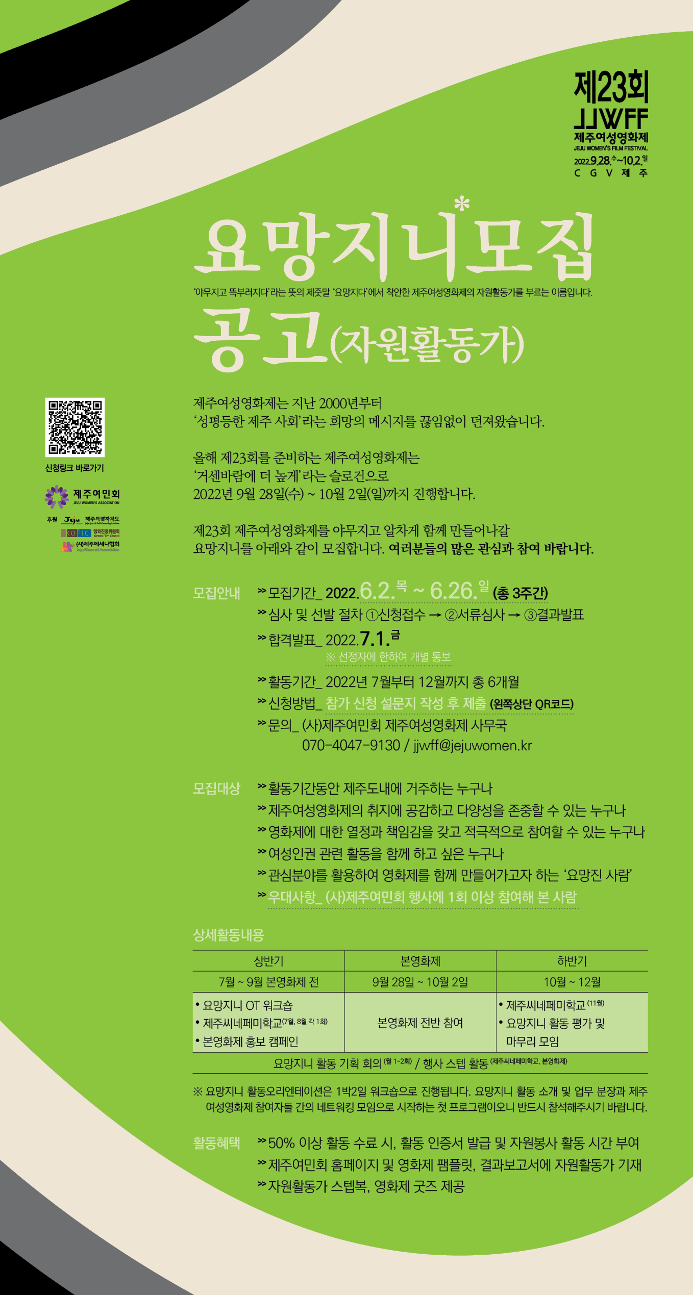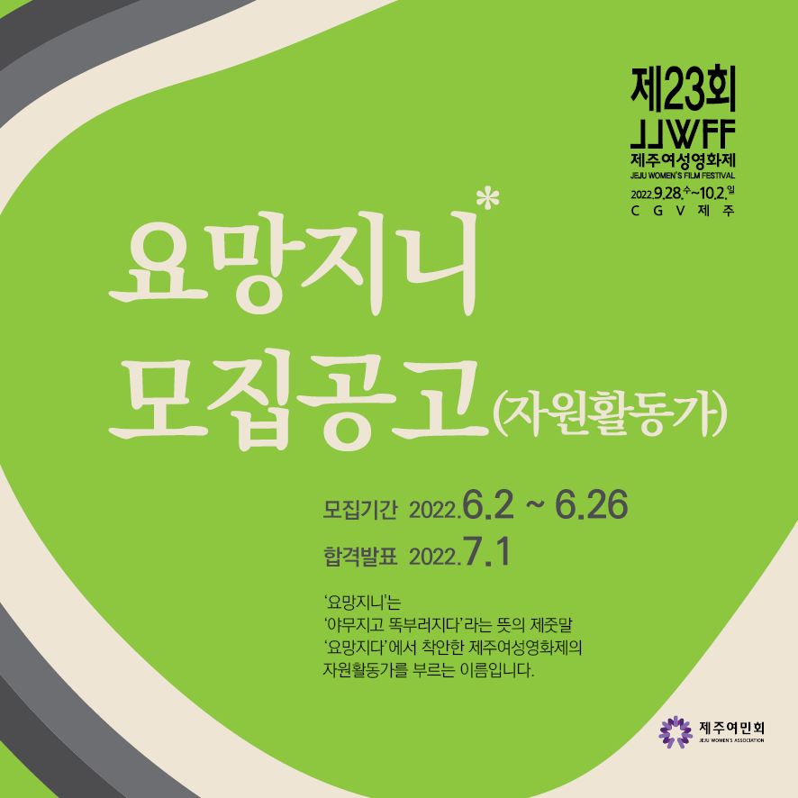 제주여성영화제는 지난 2000년부터 ‘성평등한 제주 사회’라는 희망의 메시지를 끊임없이 던져왔습니다. 올해 제23회를 준비하는 제주여성영화제는 ‘거센 바람에 더 높게’라는 슬로건으로 2022년 9월 28일(수) ~ 10월 2일(일)까지 진행합니다. 제23회 제주여성영화제를 야무지고 알차게 함께 만들어나갈 요망지니를 아래와 같이 모집합니다. 여러분의 많은 관심과 참여 부탁드립니다.